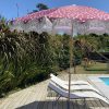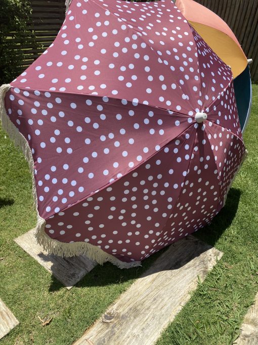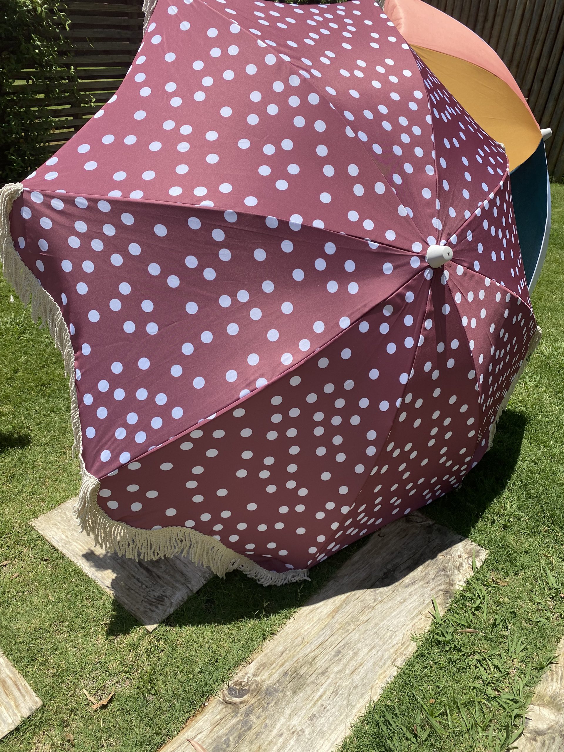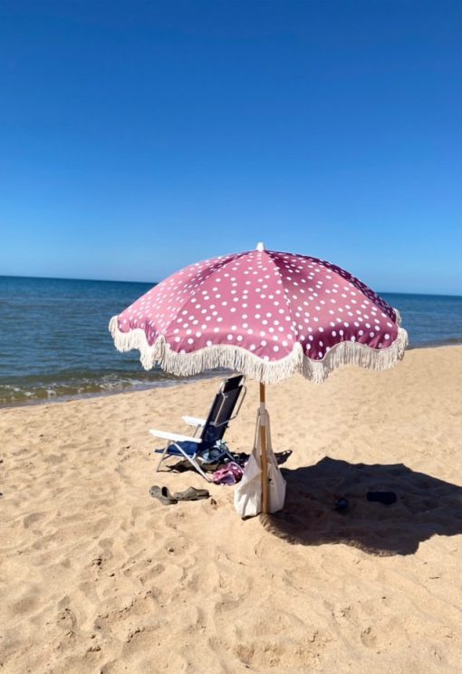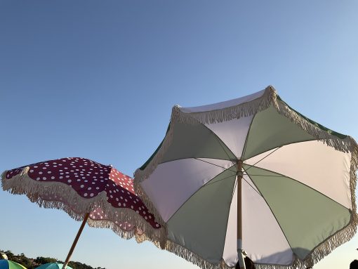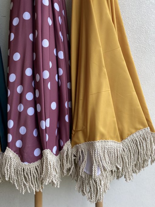 Sombrilla con palo en madera, 50 UV PF, flecos en algodón de 10 cm. Diámetro de 180 cm